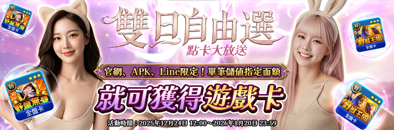 - 活動期間內,使用Gash點卡、MyCard點卡,單筆儲值指定面額成功 ,即可獲得加碼遊戲卡寶箱回饋。