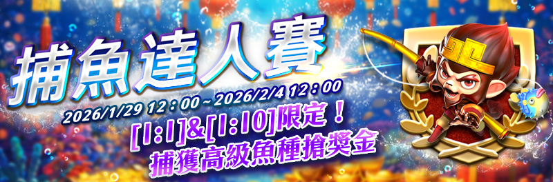 - 於1:1及1:10廳館遊玩《大魚西遊-龍宮祕寶》《大魚西遊-決戰火焰山》,使用2,000以上押分,捕獲指定魚種即可獲得對應點數!