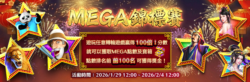 - Mega點數將會累加至排行榜中,不同廳別的點數可共同累積,榜上前100名的玩家都可獲得獎金!