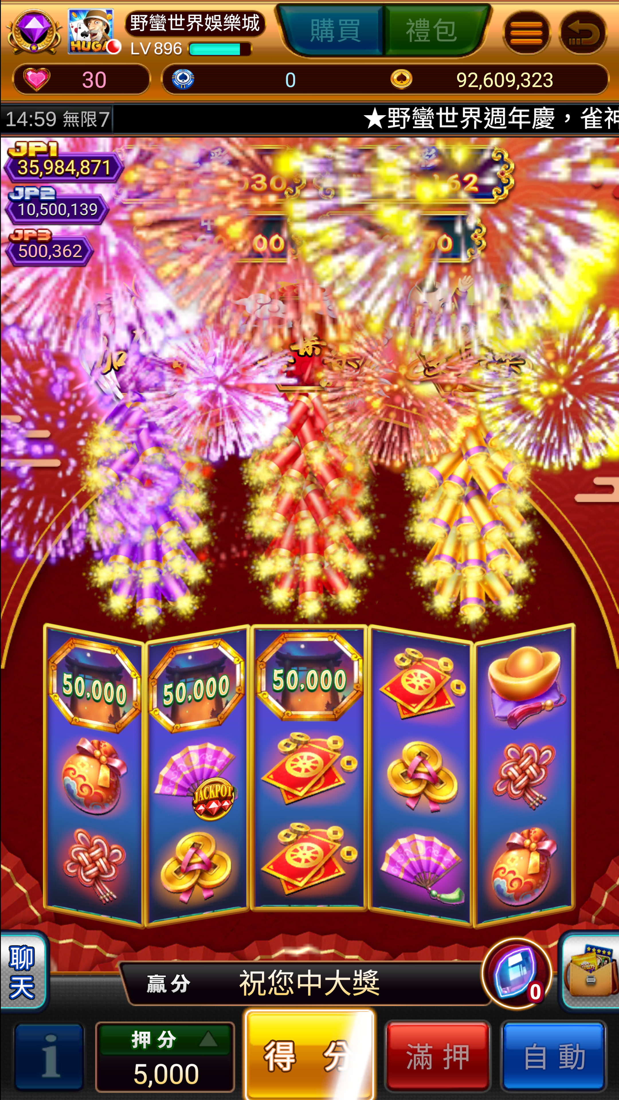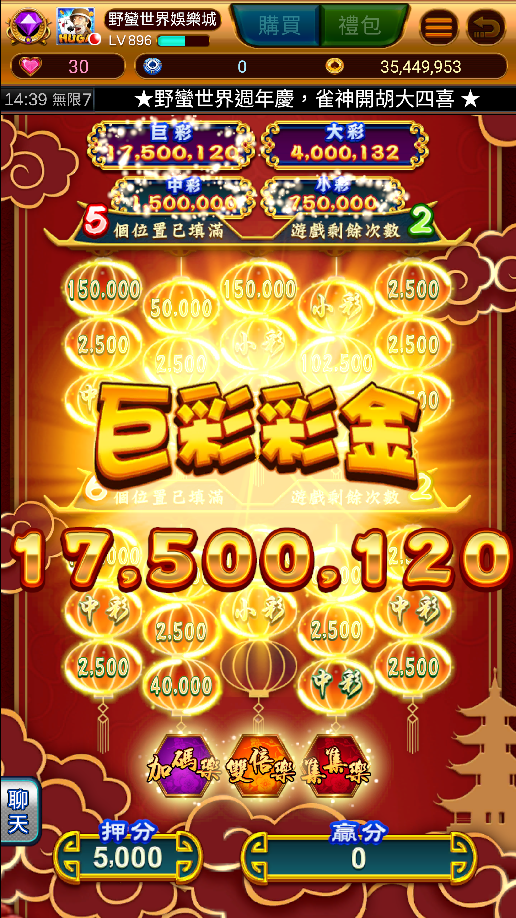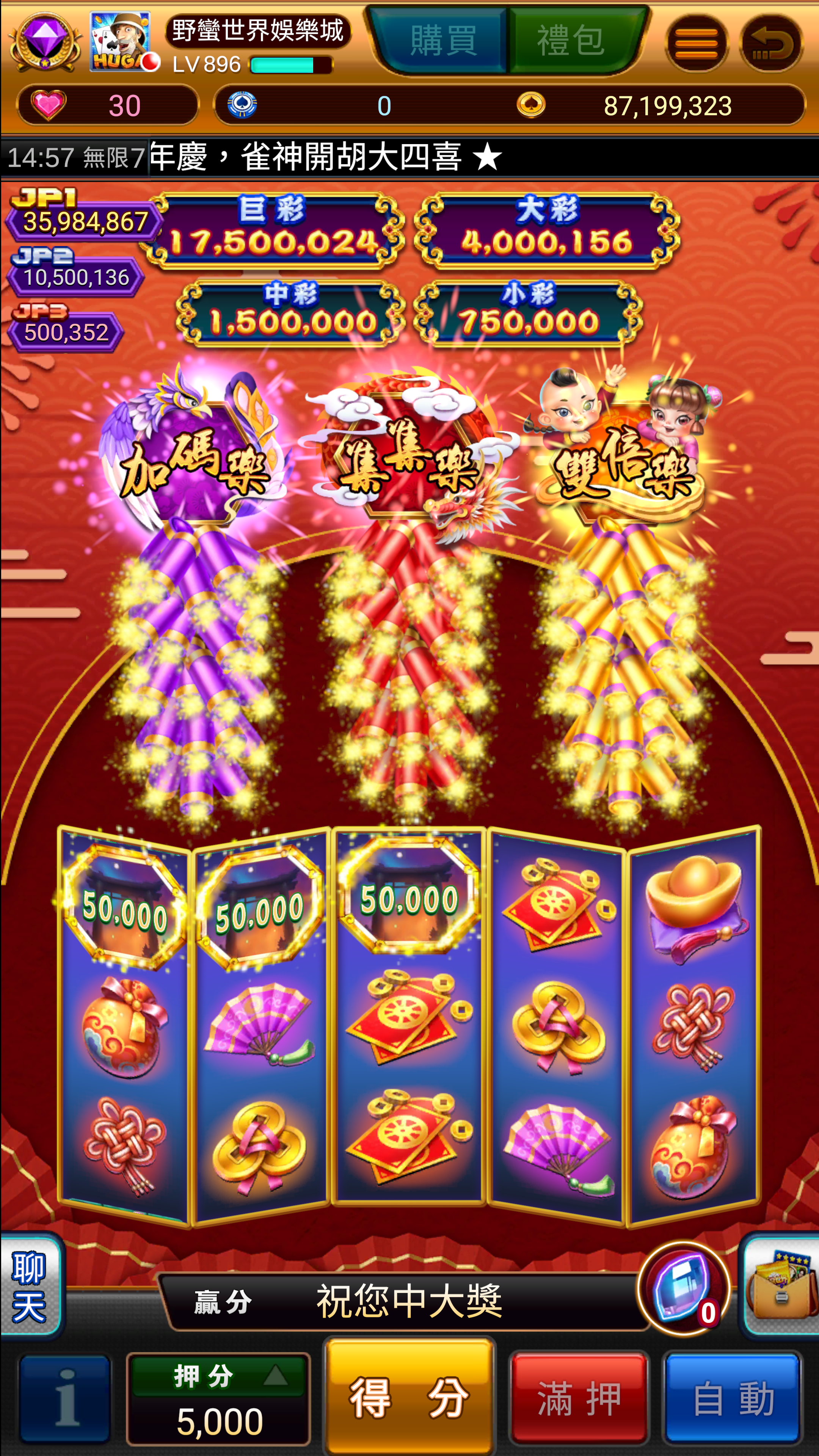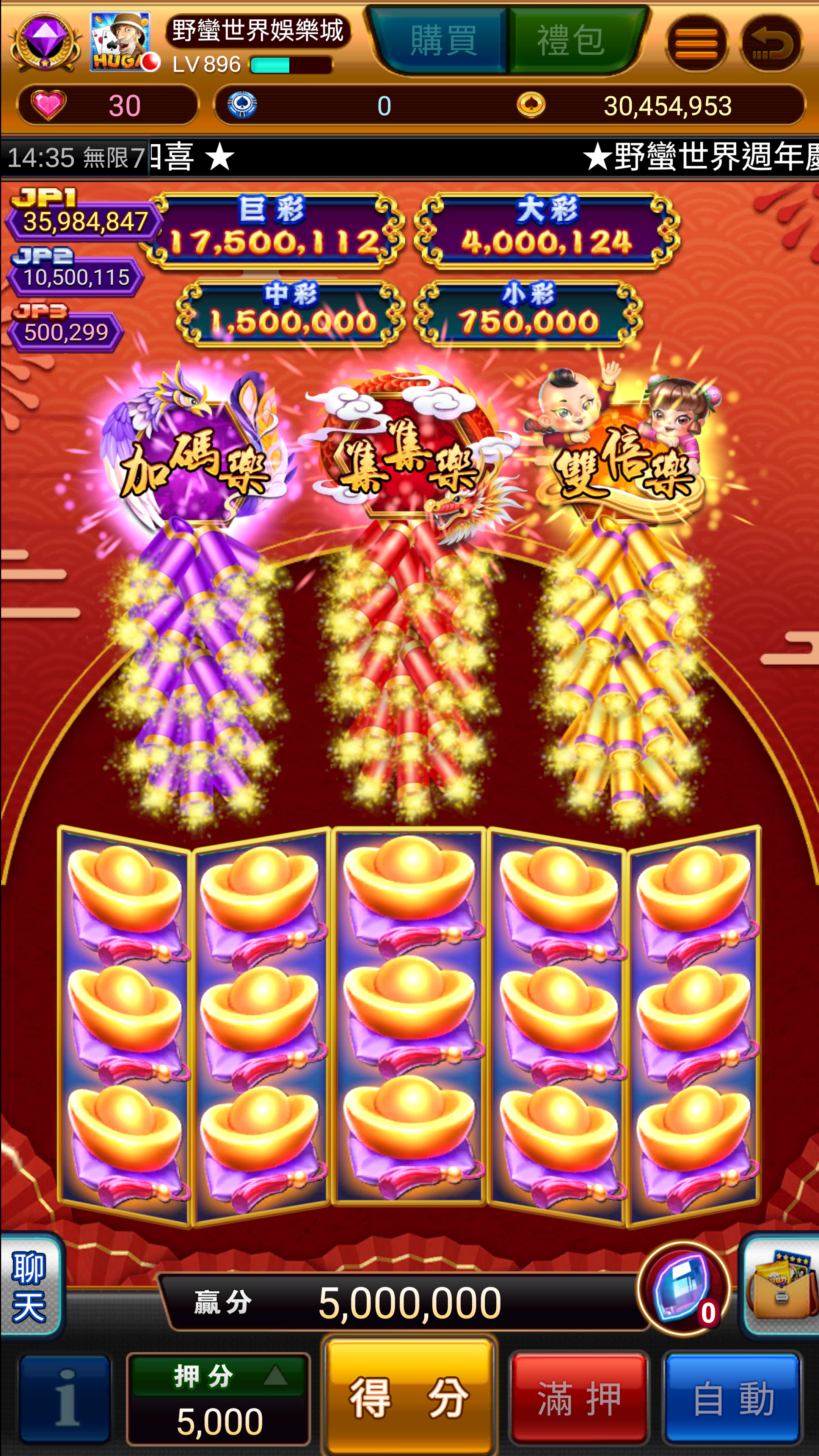 雙倍樂:當次特別遊戲變為二組3x5的滾輪,最多同時進行二組滾輪。